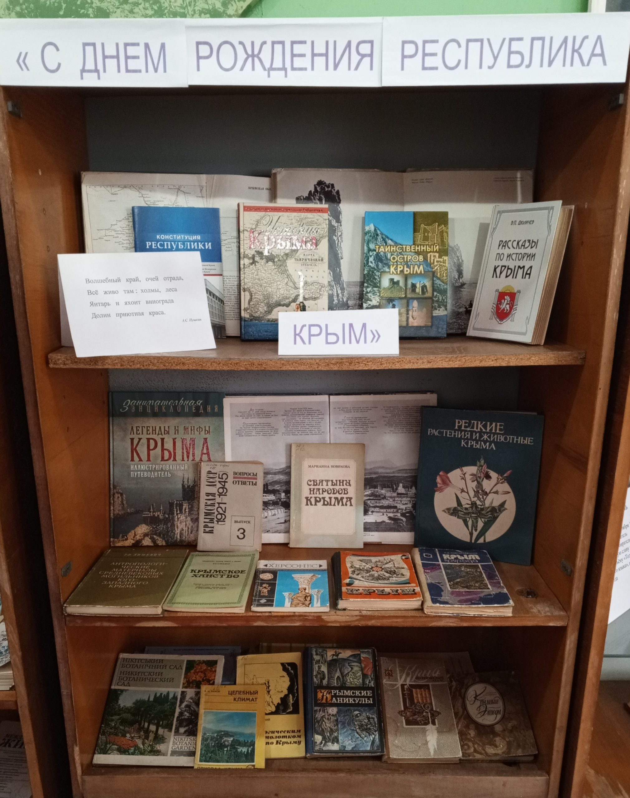 15.01.2026 года в читальном зале библиотеки оформлена книжная выставка: «С Днем Республики-Крым!» — приуроченная к Дню Республики Крым, который отмечается 20 января. День Республики Крым — государственный праздник, отмечается в Республике Крым ежегодно 20 января и учреждён в 2009 году.
