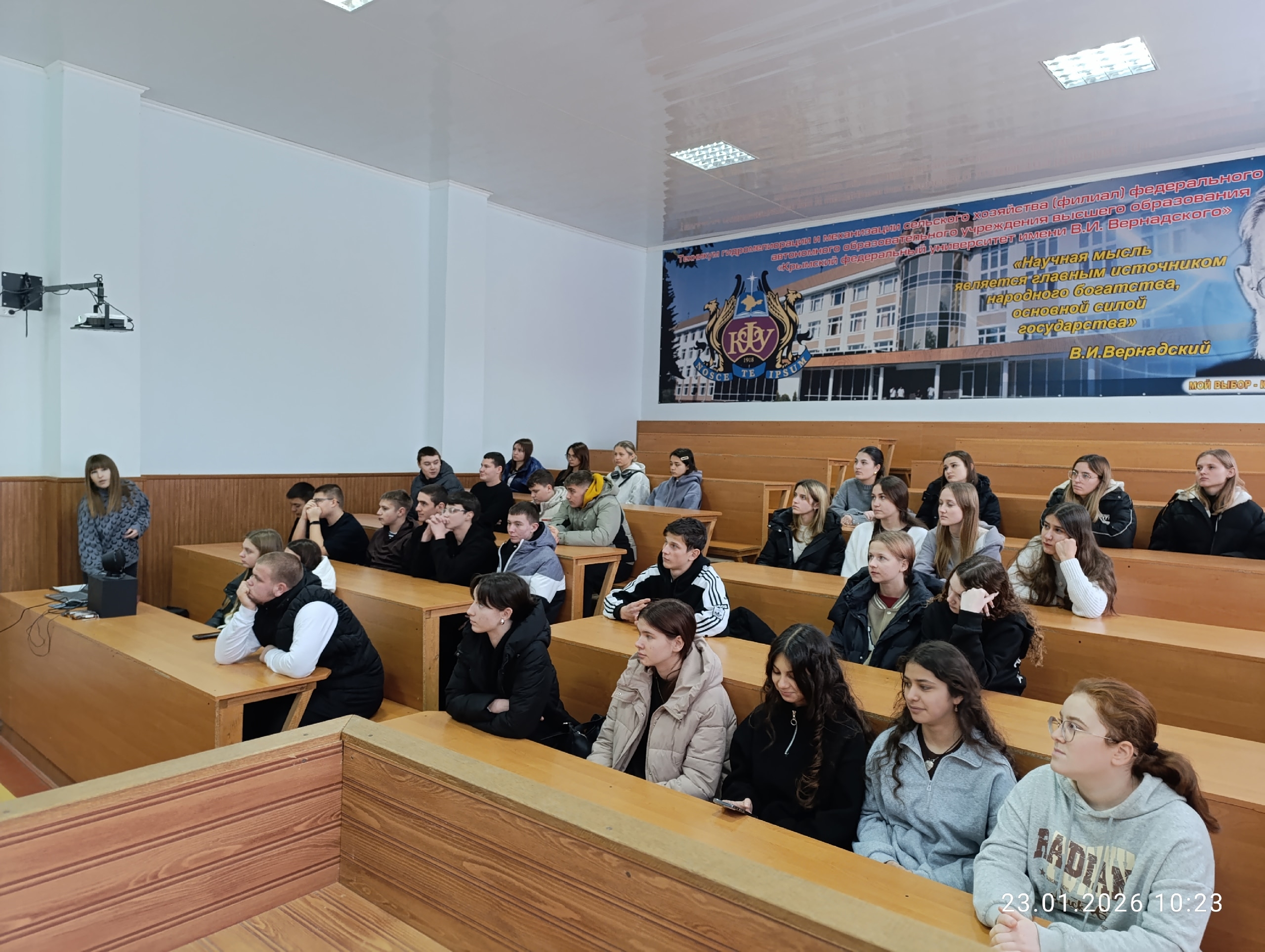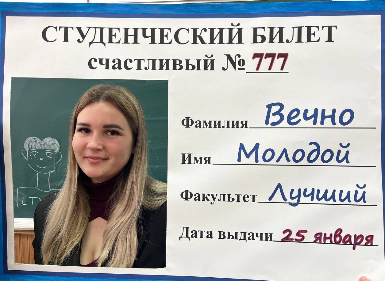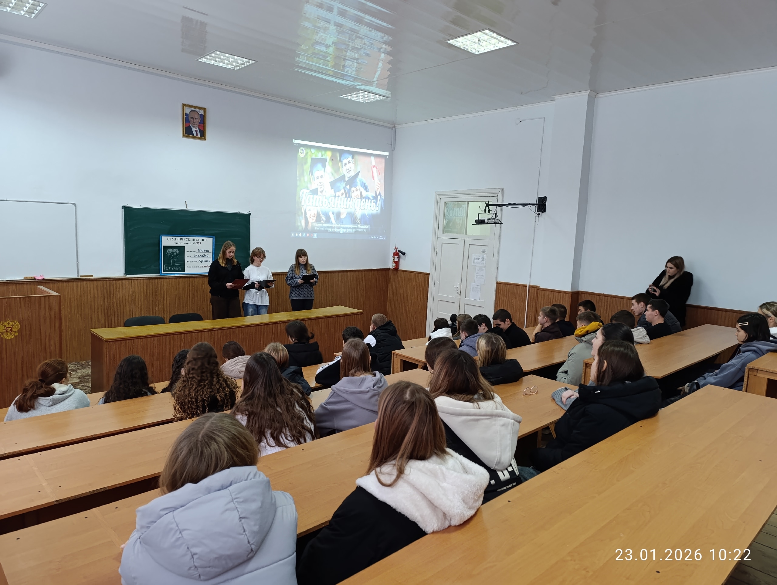 23 января 2026 года ко Дню российского студенчества в лекционном зале Техникума для первых курсов воспитатель Бойко Евгения Петровна совместно с обучающимися Фониной Татьяной и Мосиной Елизаветой провели мероприятие, которое прошло очень оживленно, эмоционально и в отличным настроением.